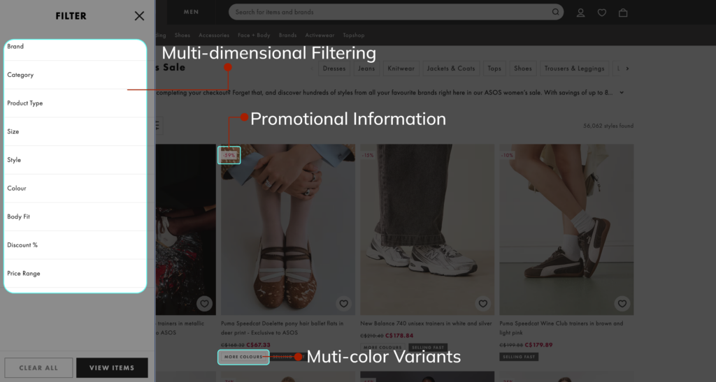 ASOS has continuously refined its PLP filtering system, introducing multi-dimensional options including style, color, fit, and size with promotional flags and color variant previews directly on product cards. Users are able to gather sufficient comparison information without leaving the listing page, measurably shortening the path to the PDP.