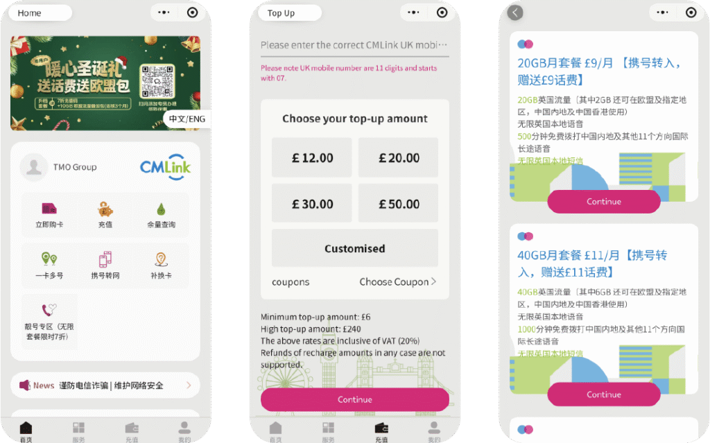 CMLink is a China Mobile brand aimed at overseas users, and its mini program gives Chinese travelers a way to sort out connectivity before or as they arrive in markets like the UK and beyond. Instead of hunting for local SIM deals or wrestling with unfamiliar carrier sites, they can handle most telecom tasks directly in WeChat.