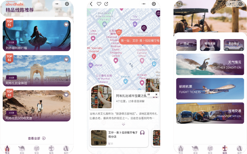 Experience Abu Dhabi is a destination mini program that helps Chinese travelers figure out what to actually do once they arrive in the UAE’s capital. Instead of piecing together blogs, maps, and random recommendations, they can browse curated options and logistics from inside WeChat.