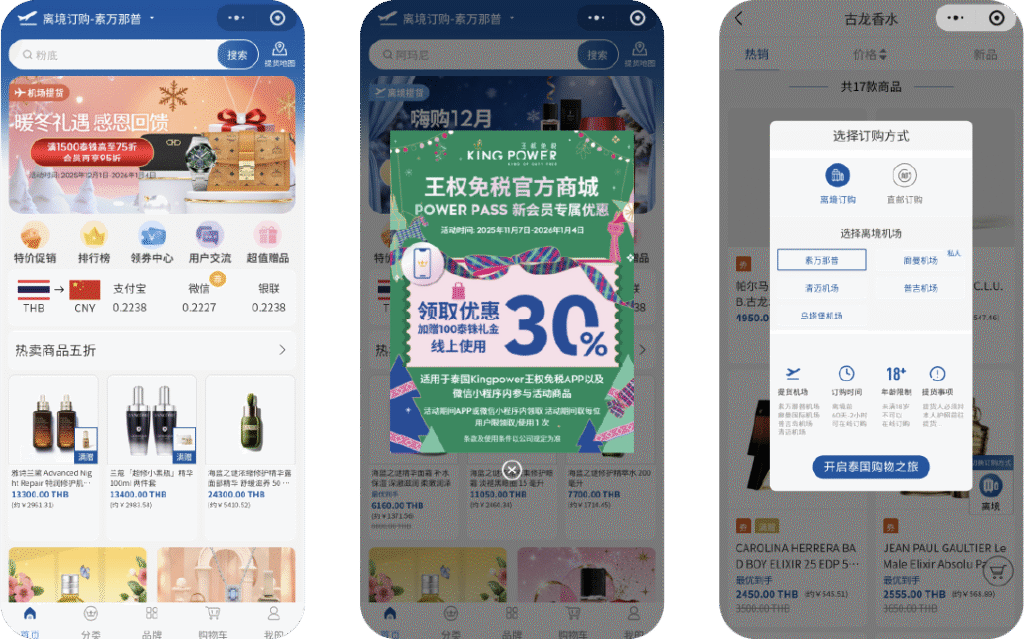 KingPower is Thailand’s flagship duty-free retailer, and its mini program brings the pre-departure shopping experience directly into WeChat. Instead of browsing in-store at the last minute, Chinese travelers can explore products, compare prices, and line up purchases long before arriving at the airport.