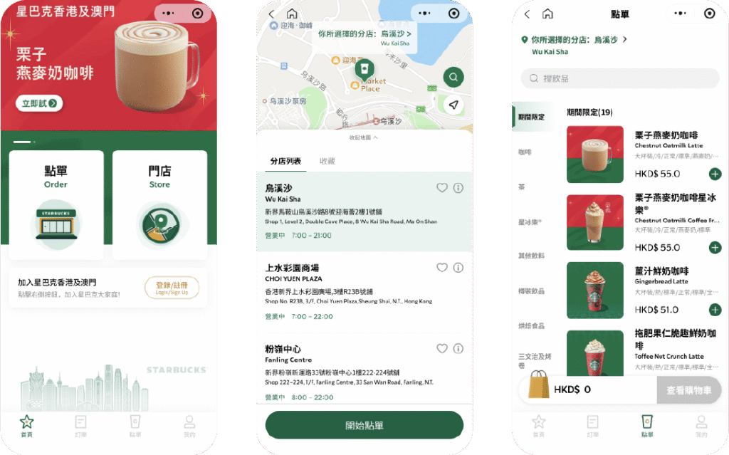 Starbucks’ Hong Kong and Macau mini program brings one of the most familiar F&B flows for Chinese travelers into a market where queues can be long and store density is high. Instead of waiting in line or navigating kiosk systems, travelers can order through WeChat, which keeps the interaction simple and fast: