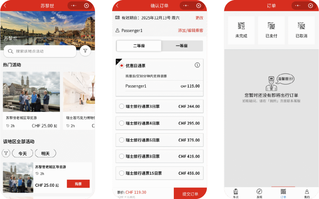 Switzerland Railway’s mini program brings transit and sightseeing into a single interface for Chinese travelers exploring the country’s well-known scenic routes. Instead of navigating unfamiliar ticket machines or multilingual transport sites, travelers can plan journeys and manage bookings directly through WeChat.