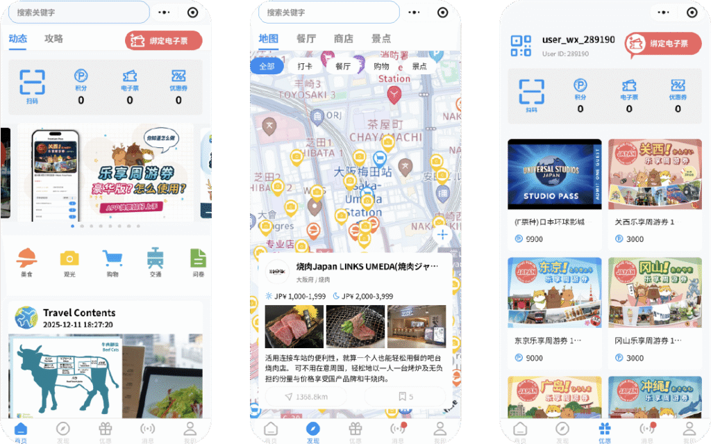 Beyond storing tickets, the mini program pushes deals and coupons, directory-style listings for attractions and services near each pass area, and a rewards and points system for repeat use. In practice, it turns the pass from a one-time voucher into a small ecosystem: users buy or bind the pass, discover where it’s worth using, and are nudged back into specific merchants through targeted offers.