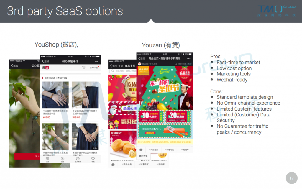 During his speech, Dominiek also touched on other WeChat eCommerce options such as Youshop (微店) and Youzan (有赞). He explained both the pros and cons of those 3rd party SaaS (Software as a Service) options. In Dominiek’s mind, 3rd party options could be ”easier to start and cost lower”, but “disadvantages are obvious too, for an enterprise: similarity with competitors, and too many limitations.”