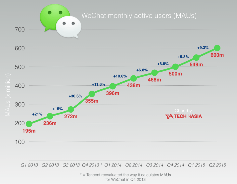 In China, WeChat user base is not only huge but also fairly active. Till the end of 3rd Quarter 2015, WeChat had 650 million monthly active users (MAUs). What’s more, the user base keeps growing: its user base had jumped up 9.8 percent in a matter of months.