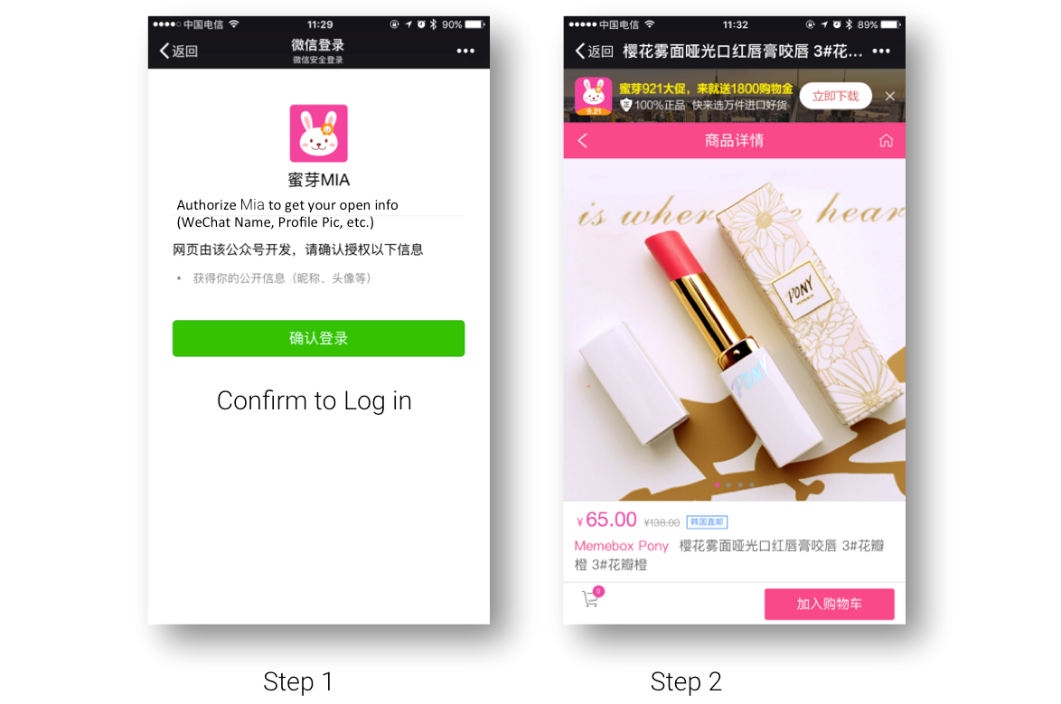 After Scanning on WeChat, you will firstly see a request asking to authorize your login info (step 1). After confirmation, it will take you to Mia’s WeChat shop.